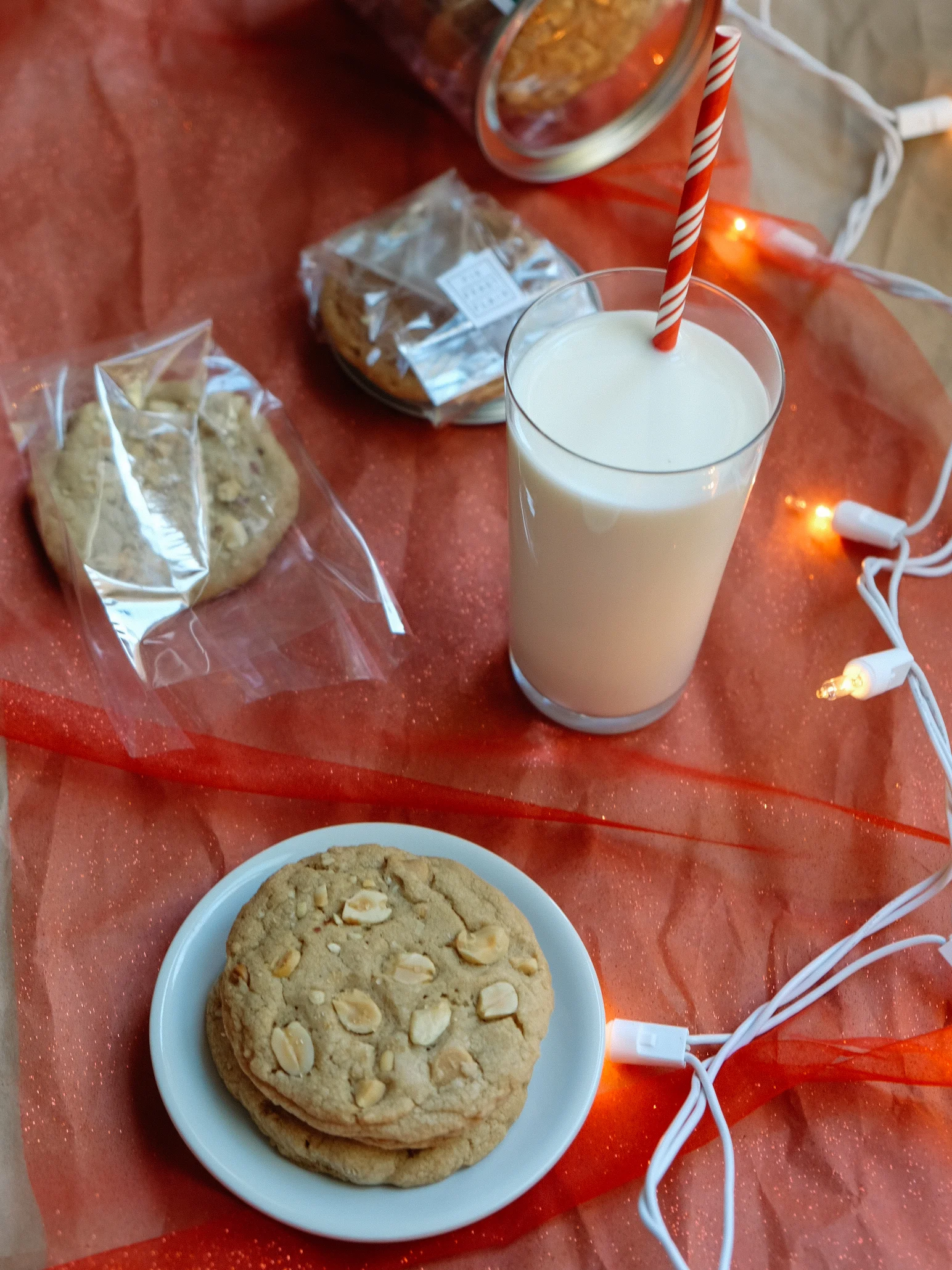 Using the 1 1/2 Tbsp. cookie scoop, scoop rounds of dough and roll tops in roughly chopped peanuts then drop onto your pre-lined pans leaving at least 2 inches between each cookie, as they will spread while baking. Feel free to press down tops slightly to make sure your peanuts are secure but this step is not necessary.
