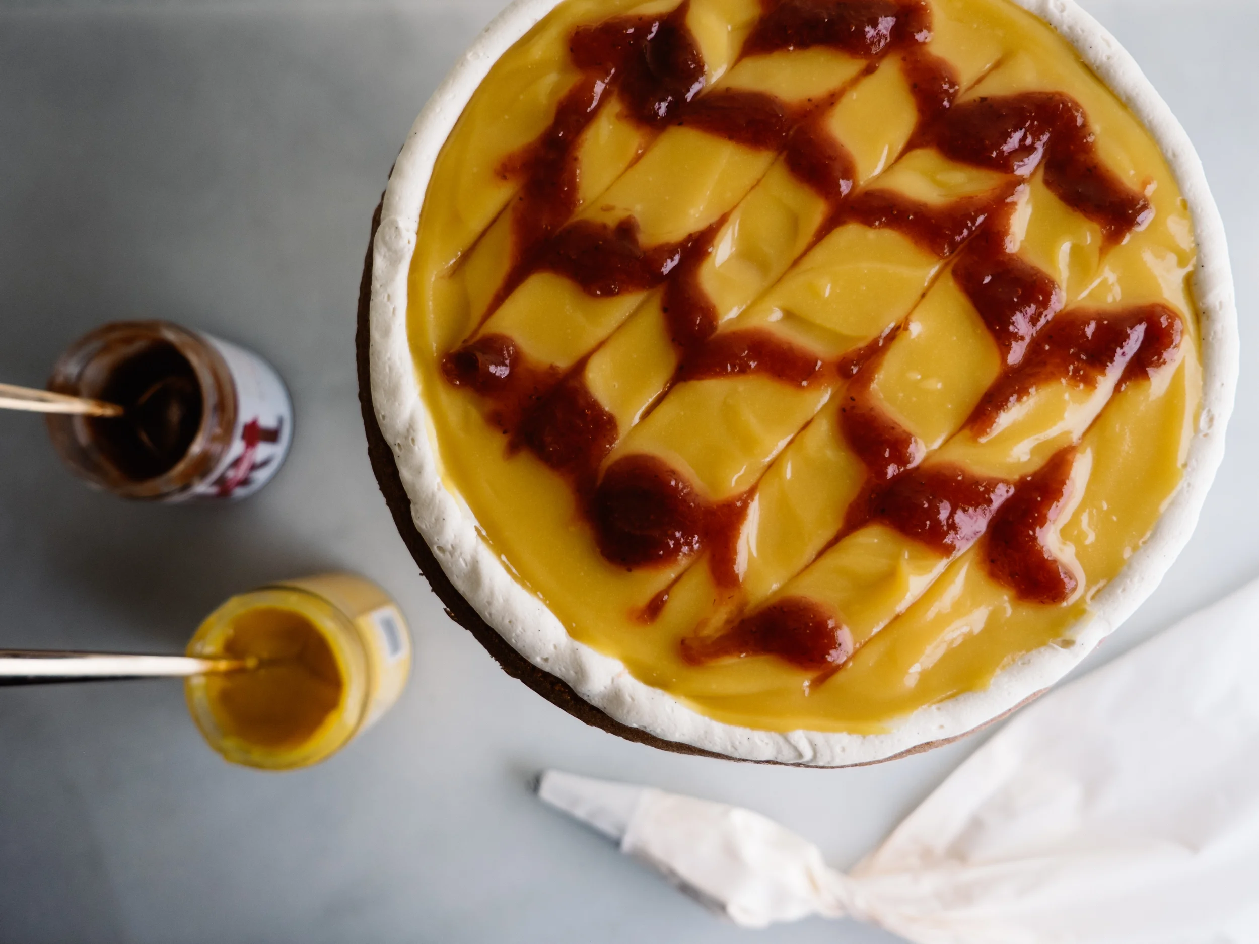 Vanilla Bean Butter Cake with Lilikoi Curd, Strawberry Rhubarb Jam, and Vanilla Bean Buttercream