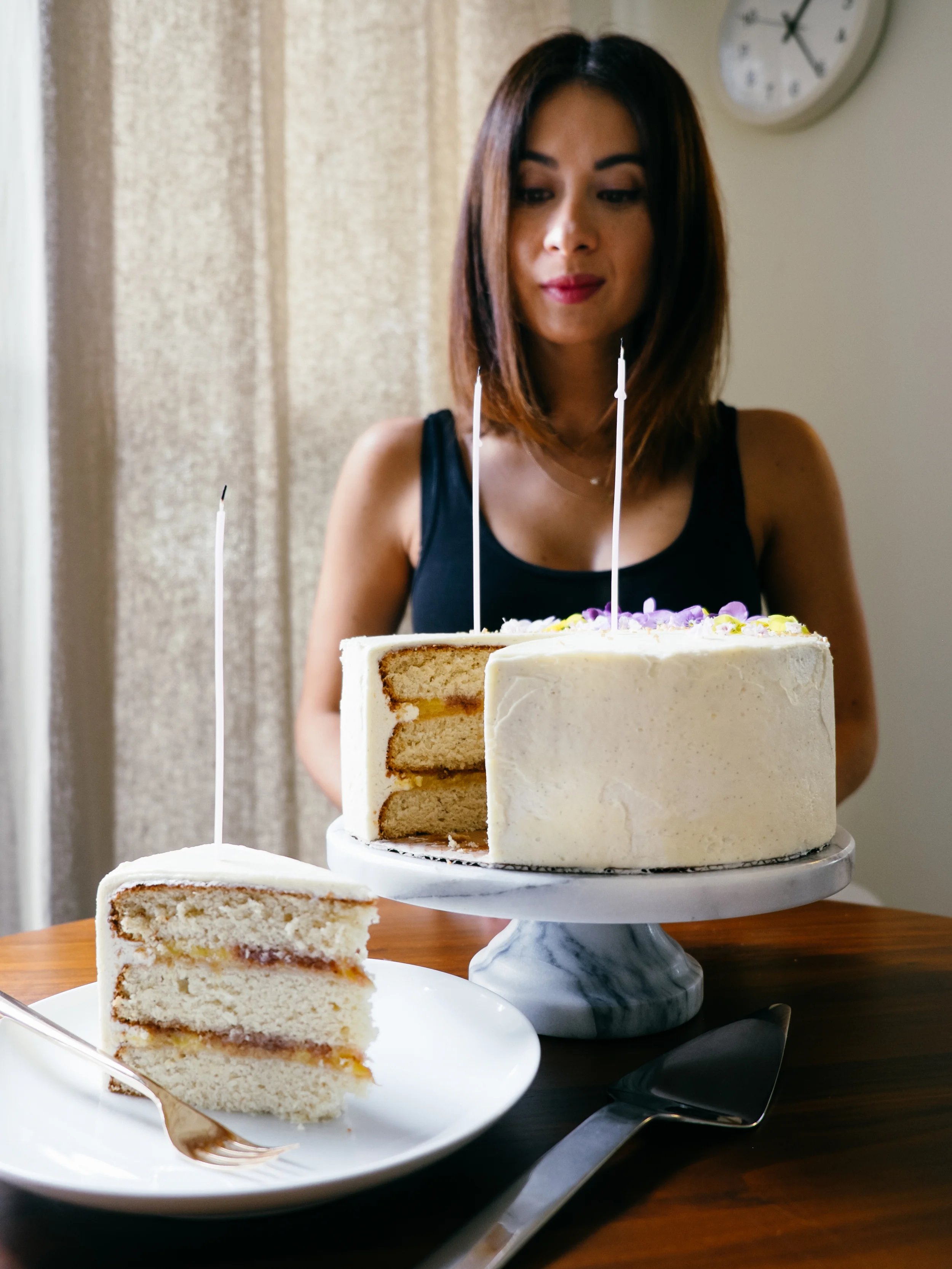 Regarding this year's birthday cake, I knew I wanted to make a cake that would stand up to a lilikoi curd and strawberry rhubarb jam filling and I couldn't think of better cake than a butter cake. And because I love me some vanilla bean paste, I of course added a healthy dose of that to the mix. Now, I have to give you the back story on butter cake because it might not be the first cake that comes to mind for most. One of my best friends worked at California Pizza Kitchen (CPK) when we were in college and she forever changed my life with that CPK butter cake (side note, where did my college metabolism go?). CPK's butter cake is insanely rich and dense, and while I definitely enjoyed my fair share of butter cakes back in the day, this cake is not quite that. While it is buttery and rich, it's much lighter and perhaps moister, thanks to the addition of the buttermilk.