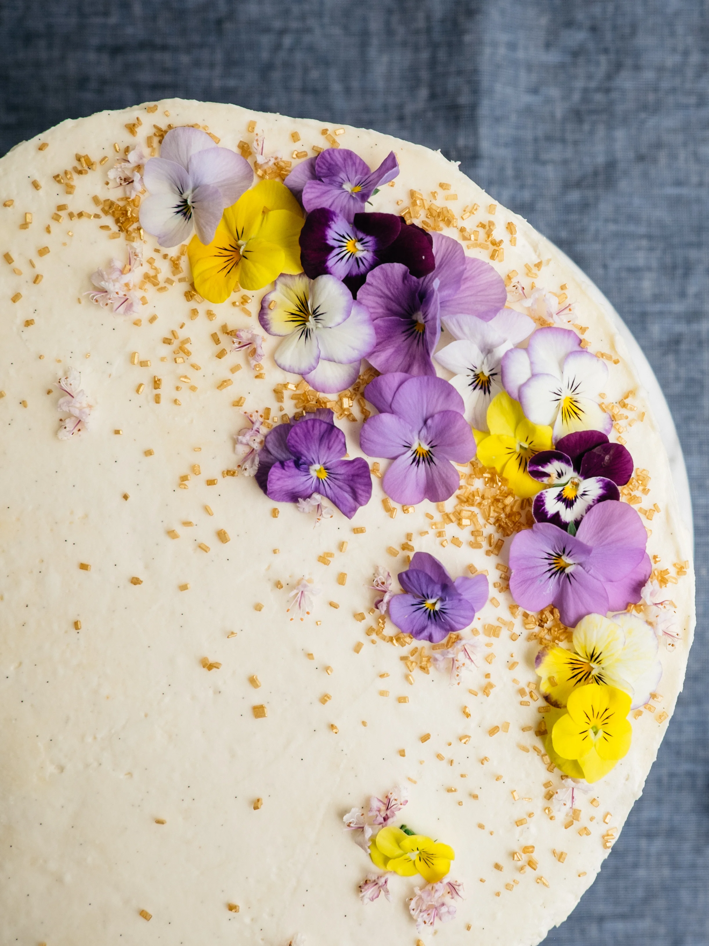 While the cake is aces, the lilikoi curd kind of steals the show. This particular lilikoi curd came from my mom's neighbor Jan's company, Maui Upcountry Jams and Jellies. Not only does it take me back to Maui but it's also some of the best lilikoi curd I've ever had. Feel free to make your own, pick up a different brand or sub a curd of your choice BUT be warned: you'll be missing out on the best lilikoi curd you've ever had (Maui Upcountry Jams and Jellies). I paired that ridiculously delicious curd with Sqirl's strawberry rhubarb jam to add a little bit of LA to the equation (and because Sqirl makes some damn good preserves). Finally, this vanilla bean buttercream takes me back to SF, as SF is the spot where I made my first buttercream (shocker?) and also where I discovered my love for vanilla bean everything. Oh!! And in case you were wondering, the violets and basil flowers came from my little garden!!