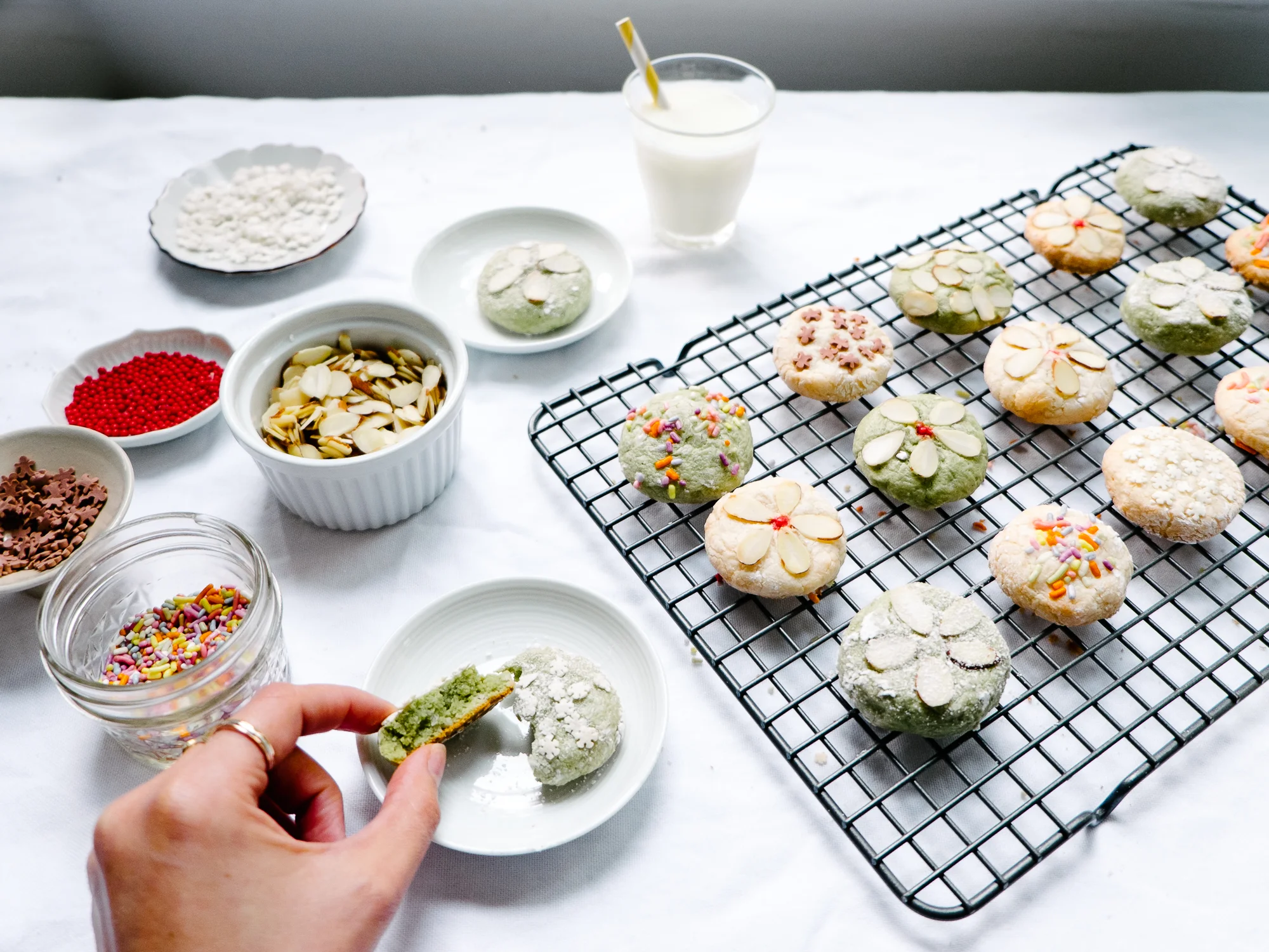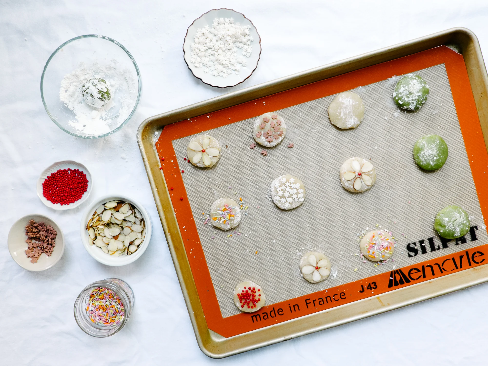 Break dough up into two halves and use a silicone dough cutter to cut each half into 12 pieces. Roll each piece into a ball, and roll in powdered sugar. It will be sticky, and gets stickier the warmer it gets, so work quickly. Gently press each ball into the sheet and decorate with toppings (optional).