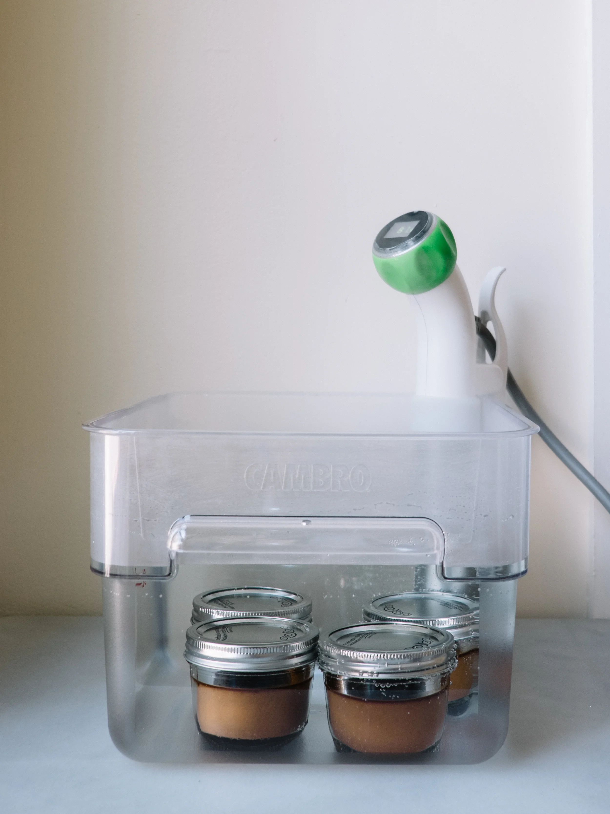- Put all 4 jars in your Cambro container, removing water if necessary (if level will be over the max amount) and sous vide for 35 minutes.