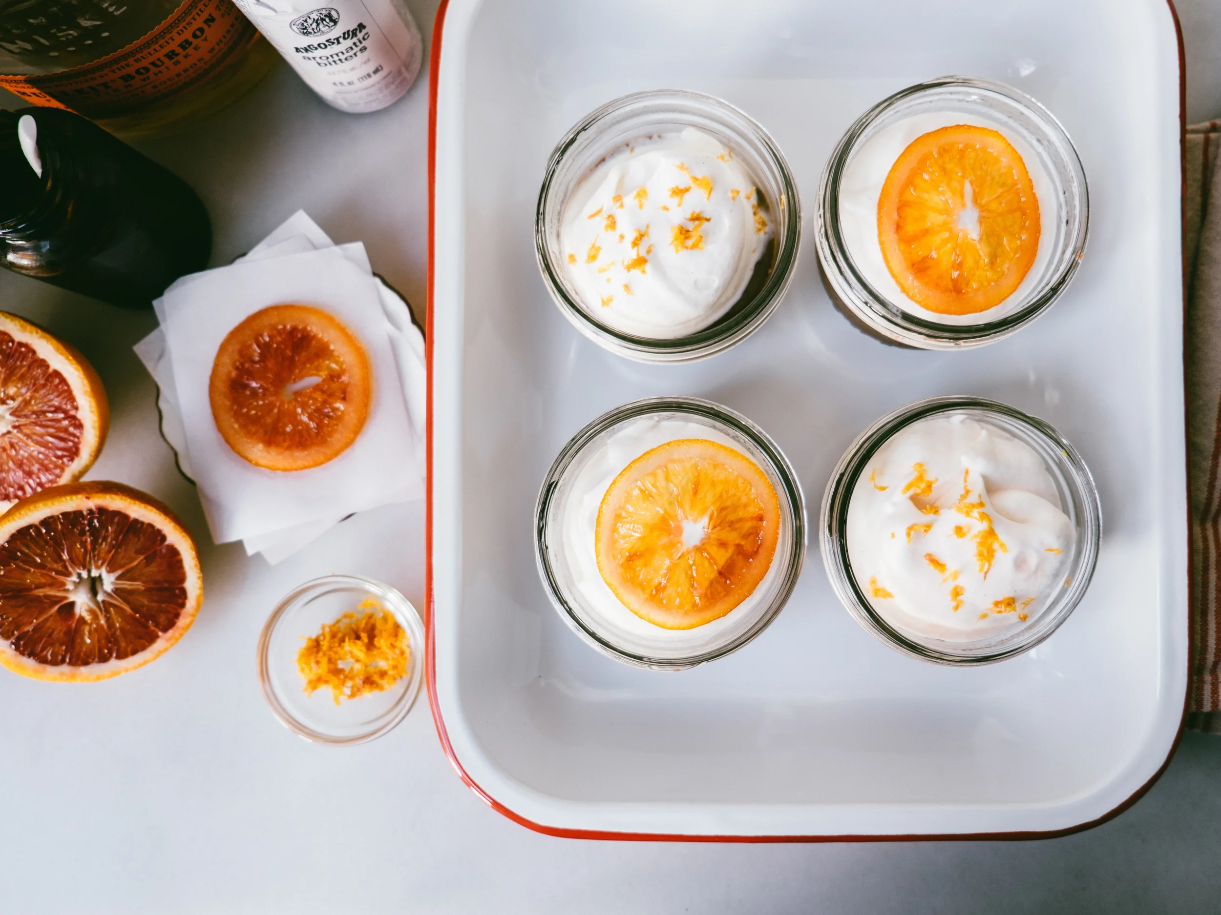 - Whisk heavy whipping cream, milk, blood orange, granulated sugar, and salt in small saucepan over medium heat. Continue mixing with spatula until mixture is simmering, the remove from heat. Whisk in chopped chocolate until smooth and completely melted. Let mixture cool for 2 minutes, stirring occasionally. Whisk in one egg yolk at a time then add 2 dashes of Angostura bitters and whisk again. Strain through fine mesh strainer. Divide mixture evenly between the 4 mason jars.