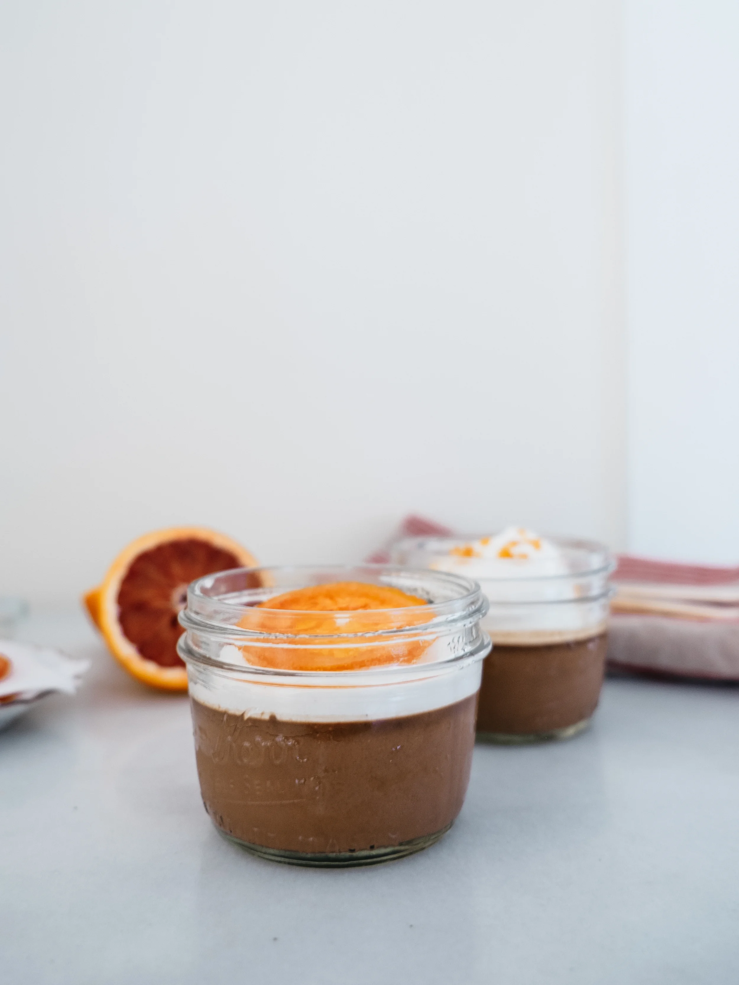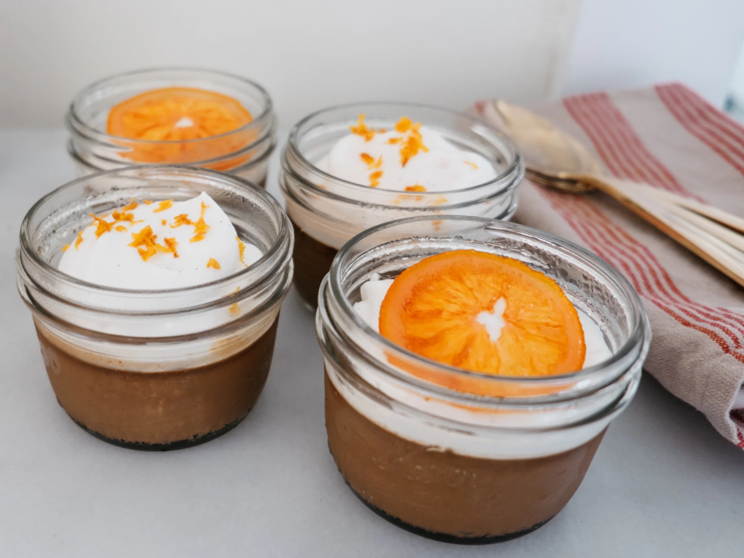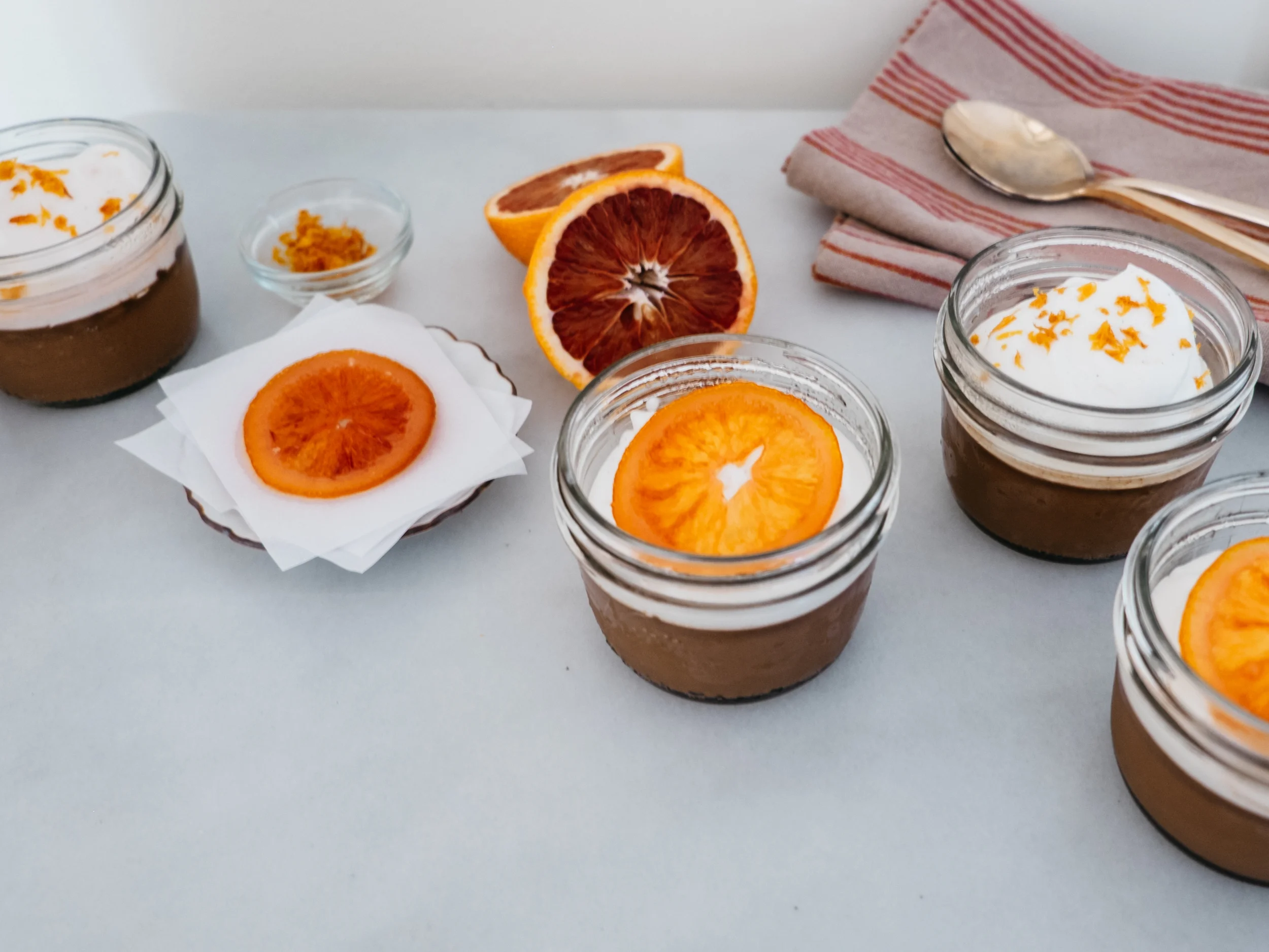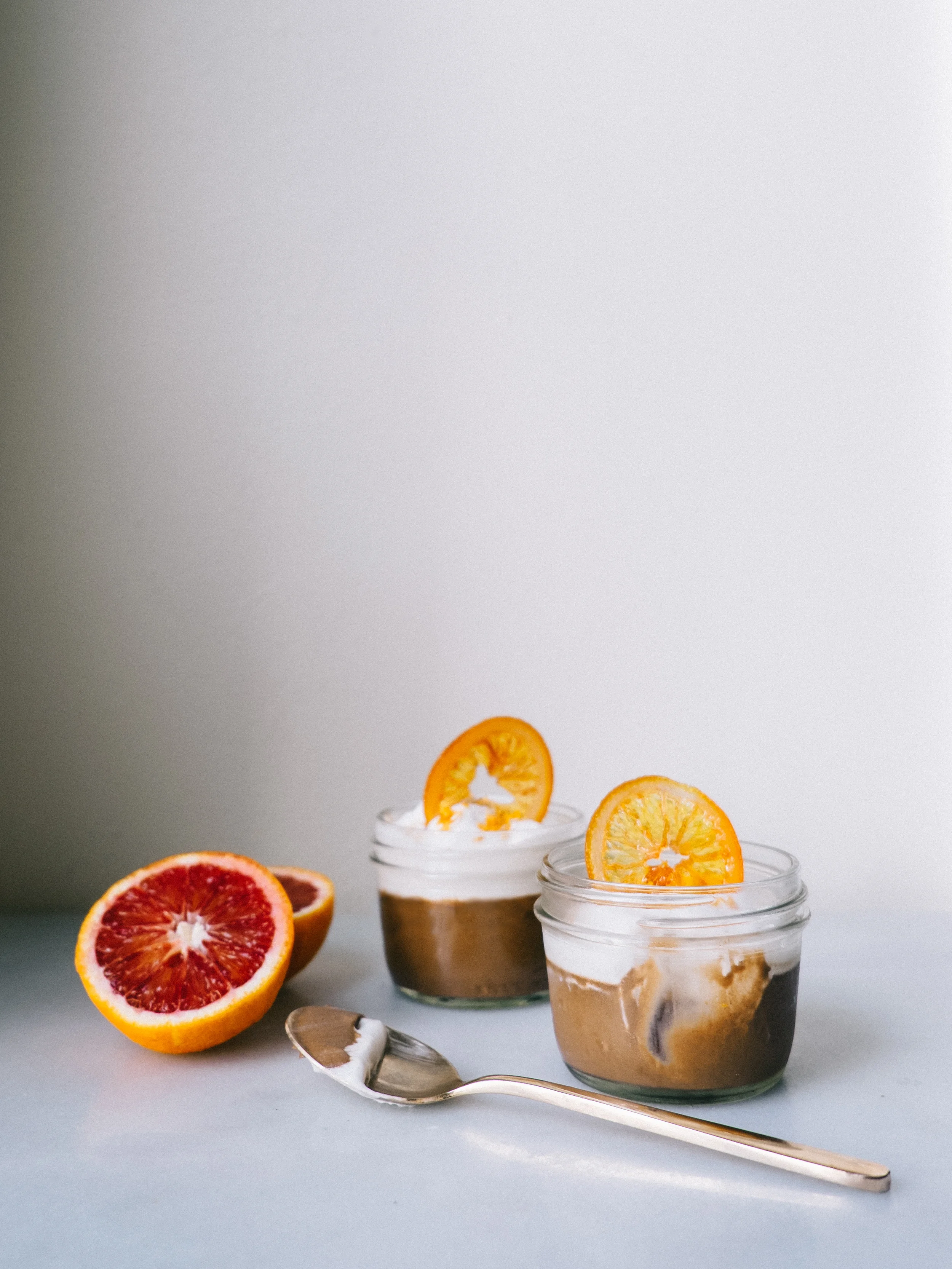 Bittersweet Chocolate & Blood Orange Pots de Creme with Maple Bourbon Whipped Cream