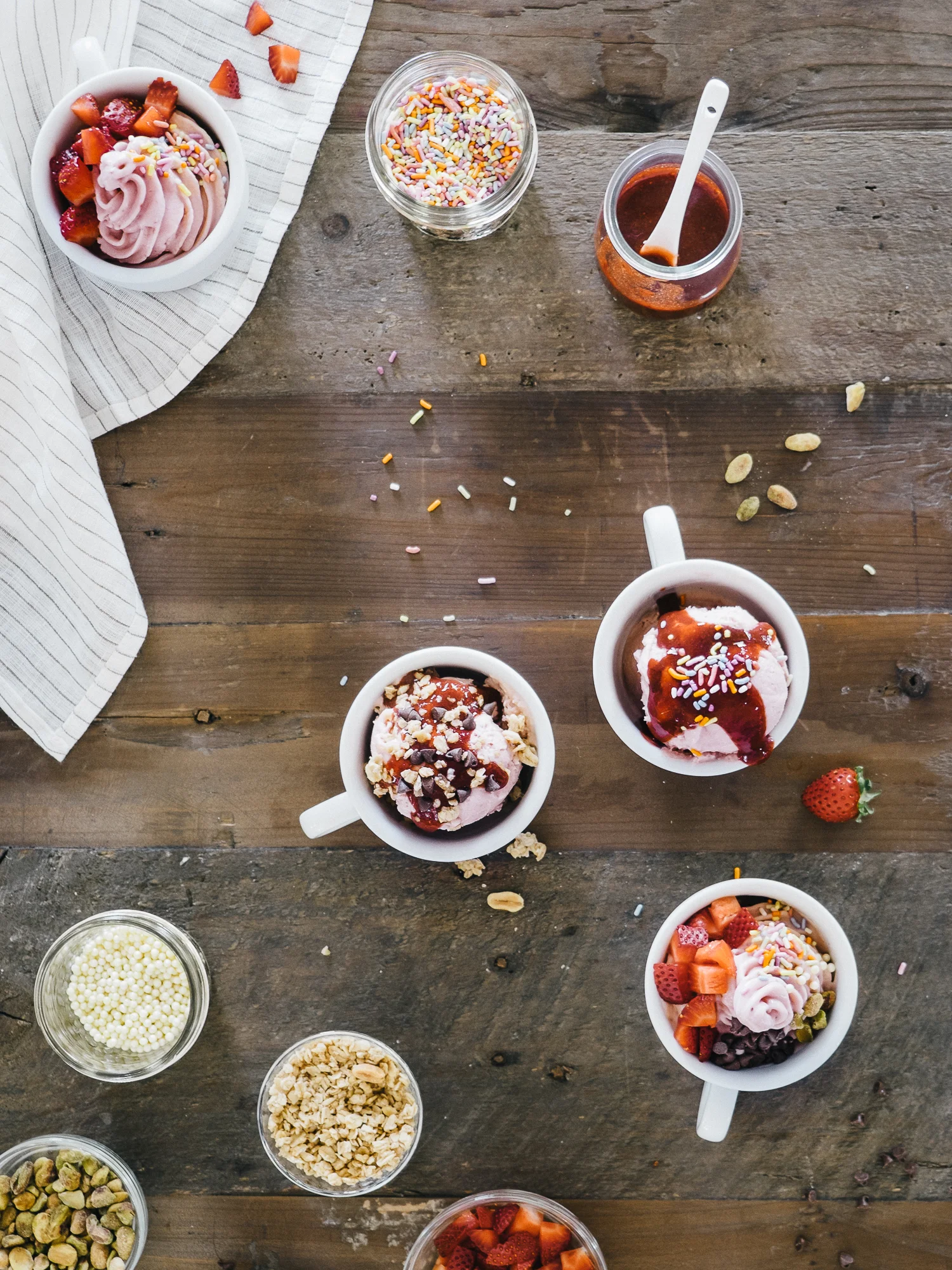 A couple quick notes about the recipe because, while it's pretty simple to whip up and guaranteed to please a crowd (I just served it at a dinner party and everyone agreed the goat's milk yogurt gives it that little extra something somethan') it does take some time (albeit it inactive time) so plan accordingly. Note that you'll be straining your goat's milk for at least six hours (in the fridge). This is followed by an additional hour of chilling once you've mixed in your remaining yogurt base ingredients. You will also need to whip up the strawberry-balsamic purée at least an hour or two prior to churning. It's simple and quick to make but it needs to chill completely before being added to the yogurt. Finally, as with most homemade ice cream recipes, this frozen yogurt is best after a couple hours of chill time in the freezer. Ok, that's it. Ready, set, froyo!