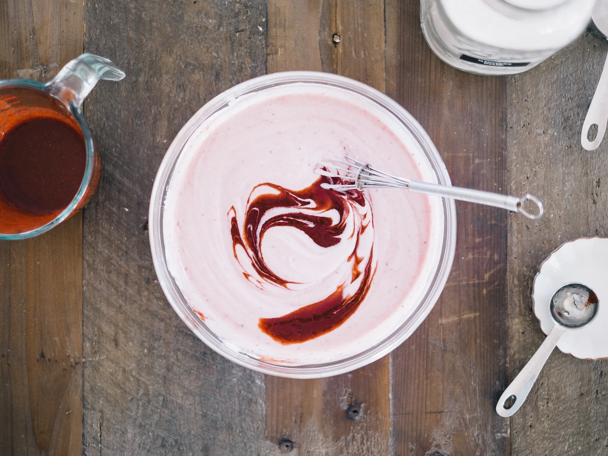 Once strained, remove yogurt from cheesecloth and strainer then whisk in the granulated sugar, corn syrup, and honey. Whisk until the sugar dissolves completely then whisk in 3/4 cup of the strawberry-balsamic purée. (Reserve the remaining purée to top the frozen yogurt.) Refrigerate for one hour.
