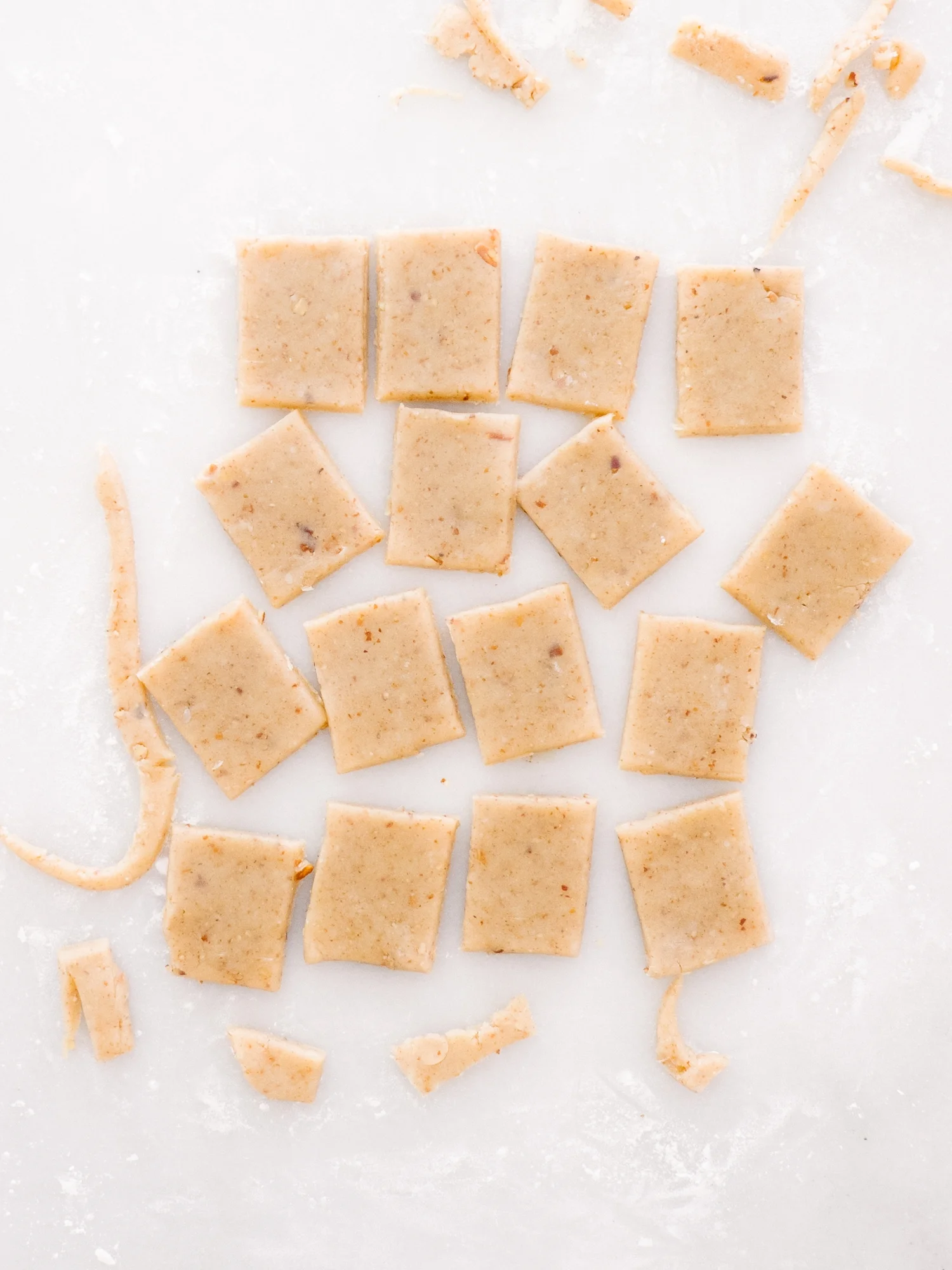 Remove the chilled dough from the refrigerator and place on a lightly floured work surface. Roll out the dough into a rectangle or square if possible until it's a thickness slightly thinner than a 1/4-inch. Using a sharp knife, cut the dough into 16 squares and transfer them to a parchment-lined baking sheet. Return the squares to the refrigerator, and chill again until cold, roughly 30 minutes more.