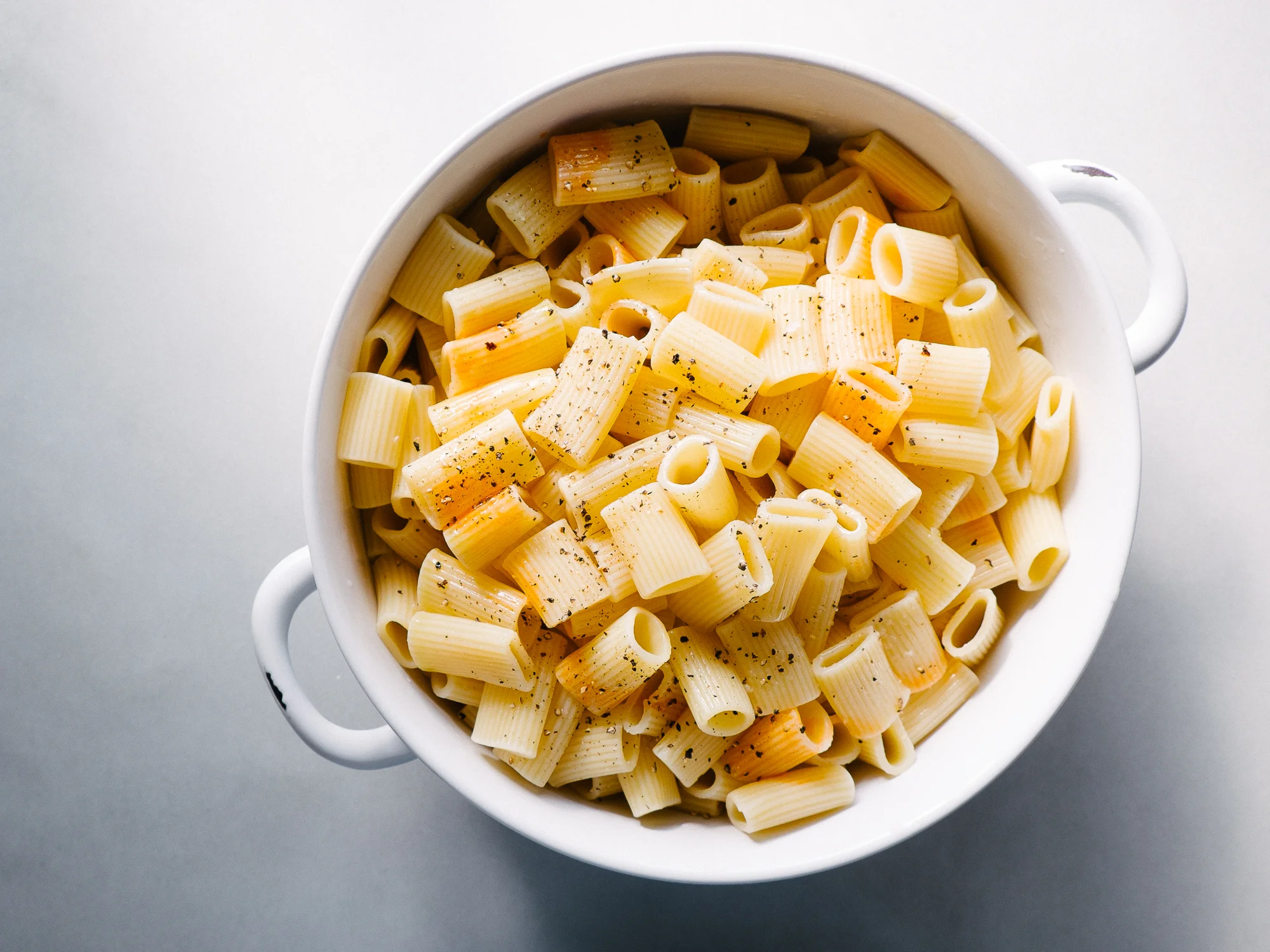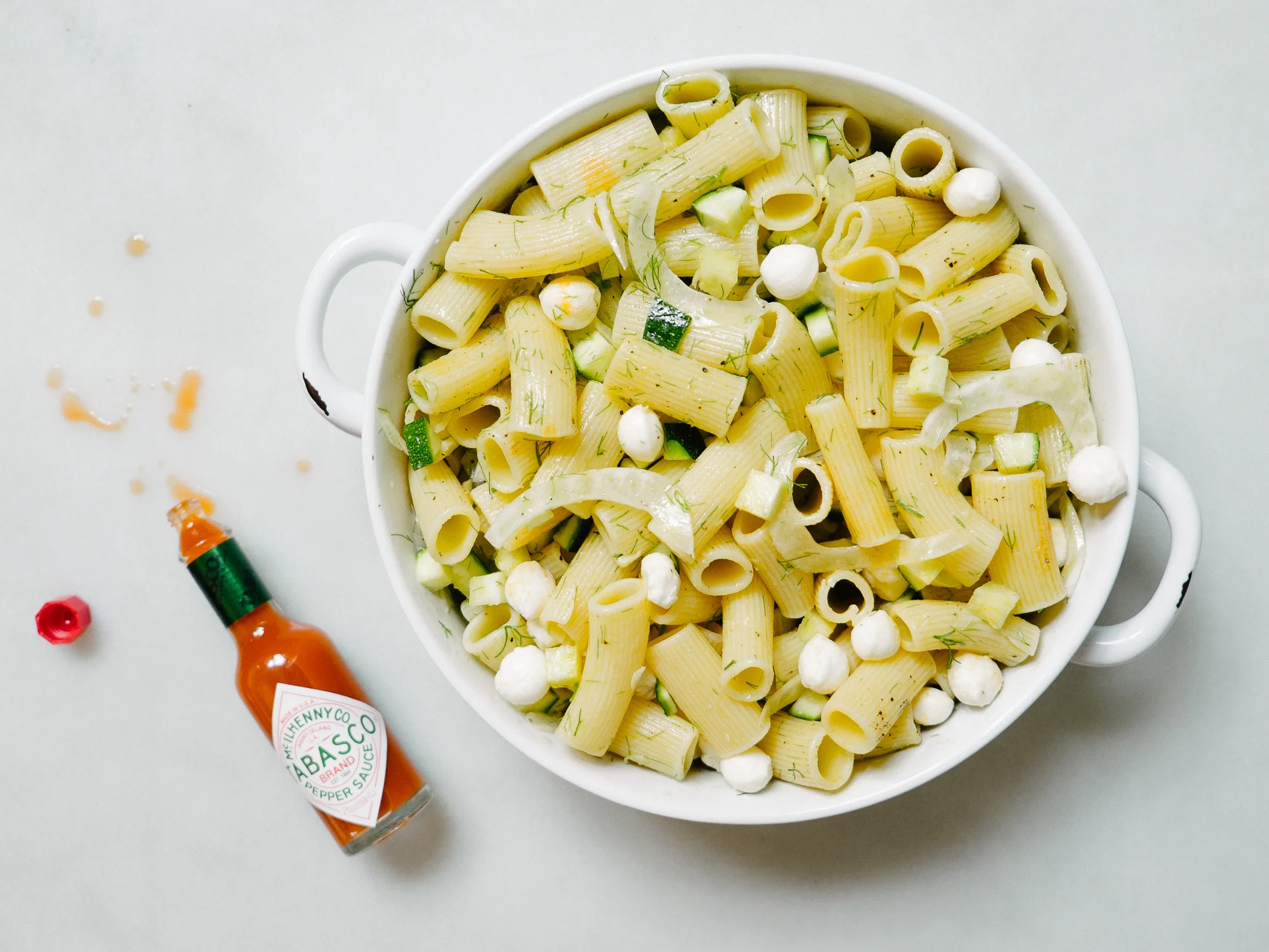 Transfer cooled, drained pasta to a large bowl and toss with olive oil and Tabasco. Generously season with salt and pepper.