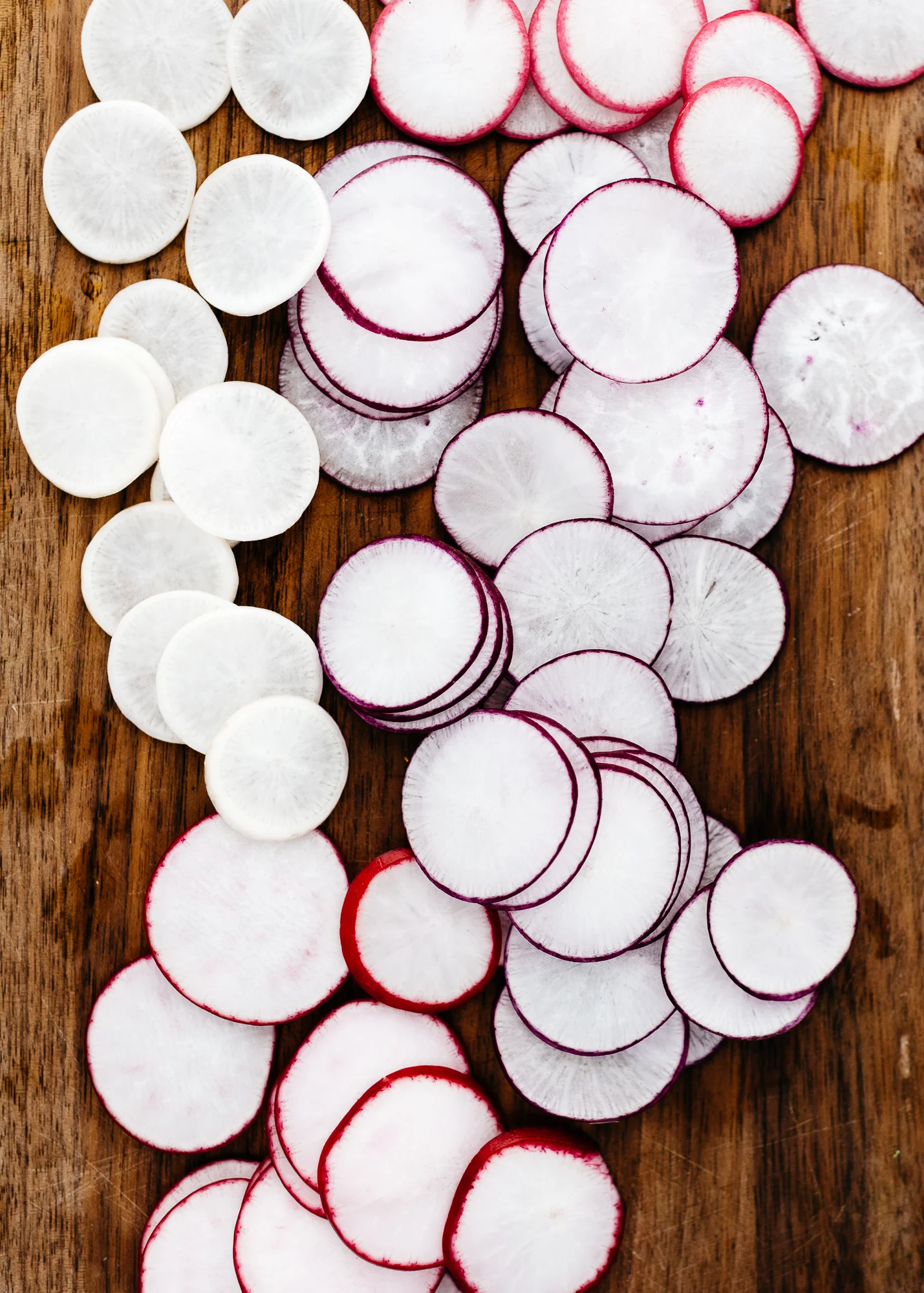 Pack the radish slices into a jar. Whisk the water, rice wine vinegar, 2 teaspoons sugar, and 1 teaspoon kosher salt together then pour over radish slices. Cover jar and refrigerate for at least 20 to 30 minutes.