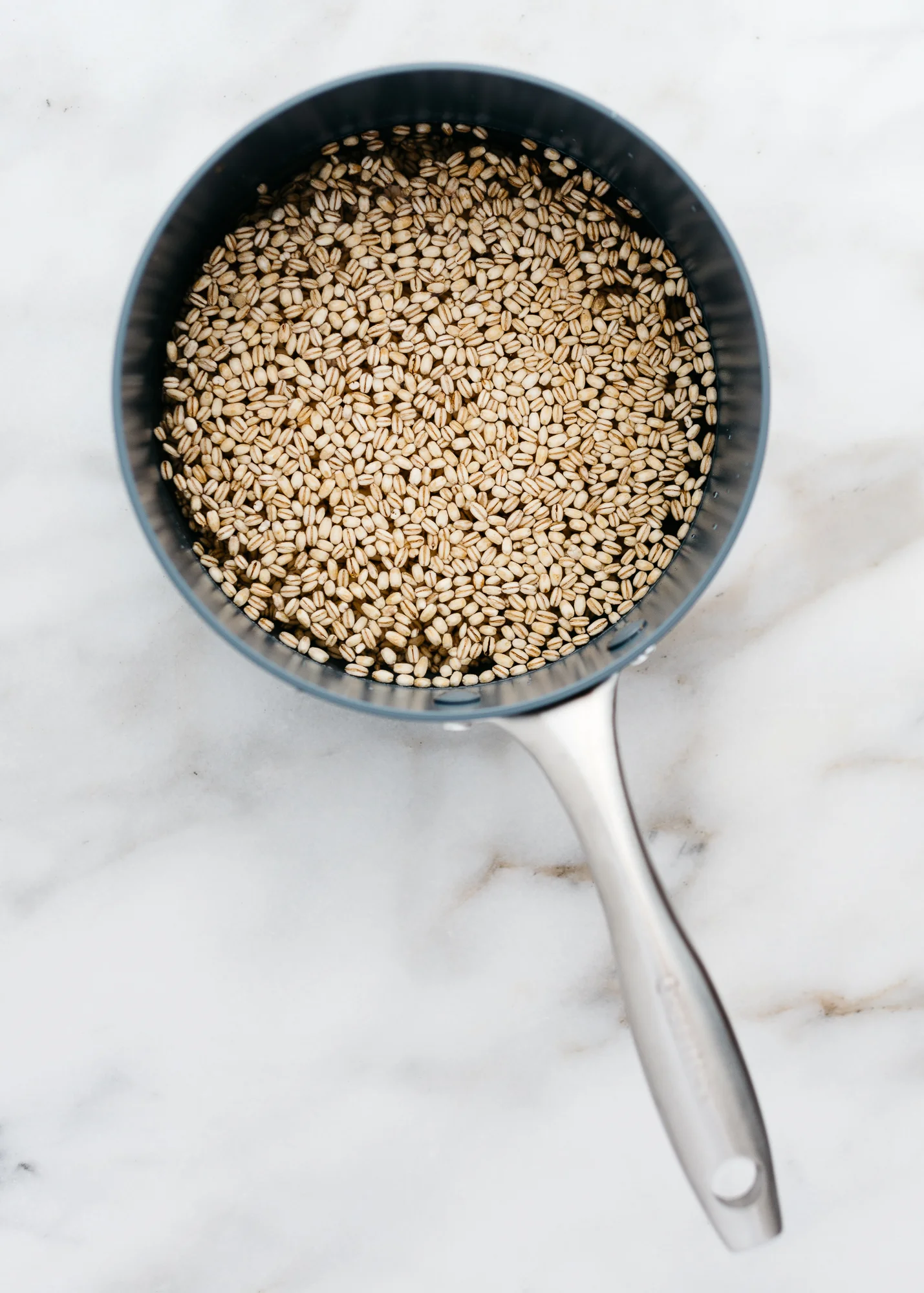 In a 2-quart saucepan, cook barley to al dente, according to package directions. Strain out any remaining water and keep barley in pan.