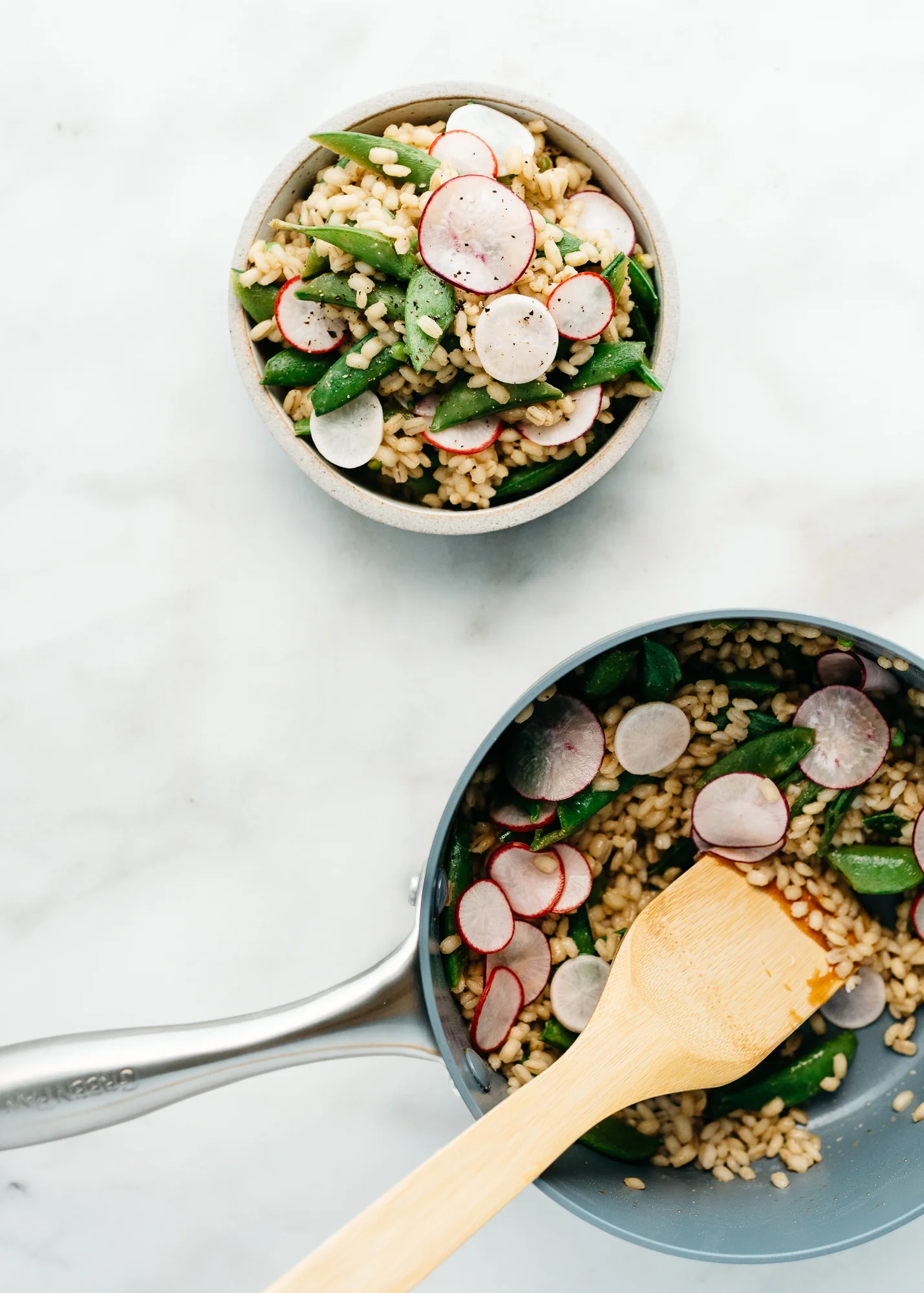 Add the sugar snap peas and any remaining sauce to the barley. Add pickled radish slices, serve, and enjoy!